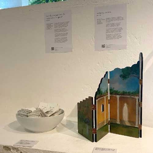 The Order of Nature is a collaborative endeavour; artists whose work address similar themes periodically contribute to the project. In May, artist Shenuka Corea debuted a two-part interactive installation through a counter-mapping workshop. Participants were encouraged to create a collective map of Lunuganga drawing from various modes of visual expression, extending the long history of artists documenting the garden. Turning Corners—a double-sided triptych painted on folding timber panels which draws inspiration from Lunuganga’s Roman Pavilion—seeks to convey the experience of unearthing new, previously hidden aspects and inhabitants of the garden as one moves through it. To accompany this piece, Corea created a zine called How do you uncover the queerness of a space? combining text that suggests links between nature and queerness with some of the garden’s most recognisable iconography.