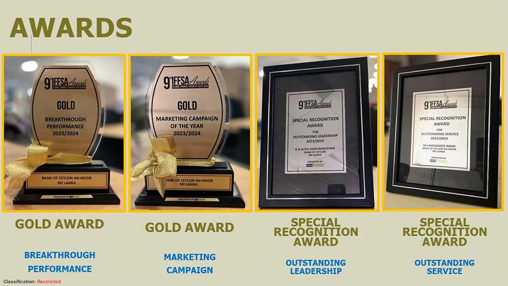 BOC AN-NOOR Islamic Banking Unit proven its excellence in the financial sector, earning two prestigious Gold Awards at the 9th Islamic Finance Forum of South Asia (IFFSA) Awards. The event, held recently at Cinnamon Lakeside, Colombo, brought together leading delegates from across South Asia to celebrate outstanding contributions to the Islamic finance industry. In addition to the Gold Awards, BOC AN-NOOR was recognized for its remarkable contributions to the growth and development of the Islamic banking sector, marking a proud moment for the Bank of Ceylon.