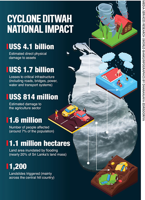The World Bank’s Global Rapid Post-Disaster Damage Estimation (GRADE) report in 2025 provided a lower bound estimate of the damage at around four percent of Sri Lanka’s GDP or US$ 4.1 billion in direct physical damages.