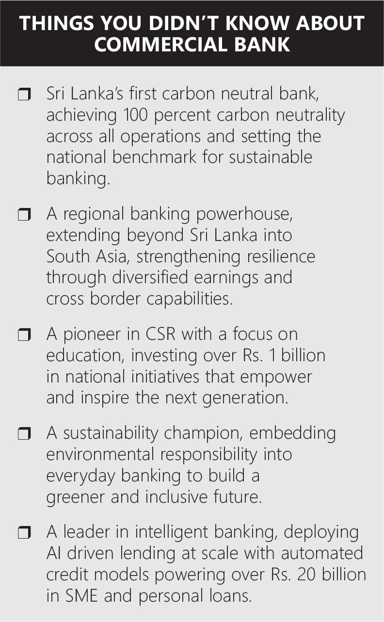 Commercial Bank translates scale into unmatched reach and convenience. It has the largest private sector branch and ATM network in Sri Lanka, robust card issuance and acceptance, and sustained investment in digital and physical infrastructure. It became the first Sri Lankan bank to surpass US$ 1 billion in market capitalisation, demonstrating strong investor confidence.