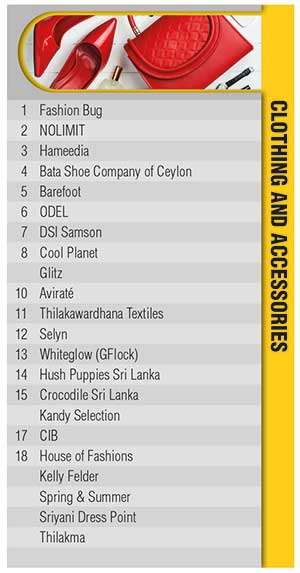 For the second consecutive year, Fashion Bug retains its leading position in the clothing and accessories category with NOLIMIT, Hameedia, Bata Shoe Company of Ceylon and Barefoot as close contenders.