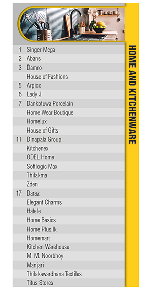 Among home and kitchenware stores, Singer Mega gains top position, followed closely by Abans, Damro, House of Fashions and Arpico.