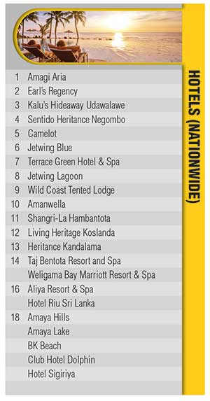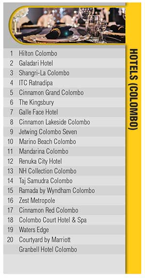 In the Colombo hotels category, Hilton Colombo holds the prime position, followed by Galadari Hotel, Shangri-La Colombo, new entrant ITC Ratnadipa, and Cinnamon Grand Colombo.