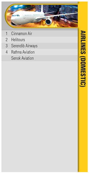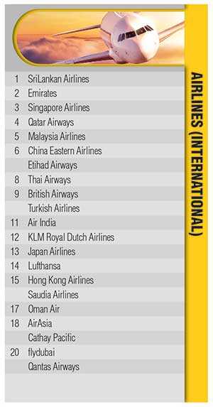 In the international airlines category, the national carrier SriLankan Airlines retains its lead over Emirates, Singapore Airlines, Qatar Airways and Malaysia Airlines. Meanwhile, Cinnamon Air, Helitours and FITS Aviation are the most popular choices in the domestic airlines segment.