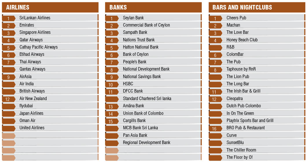 LMD’s survey encompassed telcos, and the top three most service oriented are Dialog, SLT-Mobitel and Airtel. In the airlines cate-gory, the national carrier SriLankan Airlines takes the lead over Emirates, Singapore Airlines, Qatar Airways and Cathay Pacific Airways.