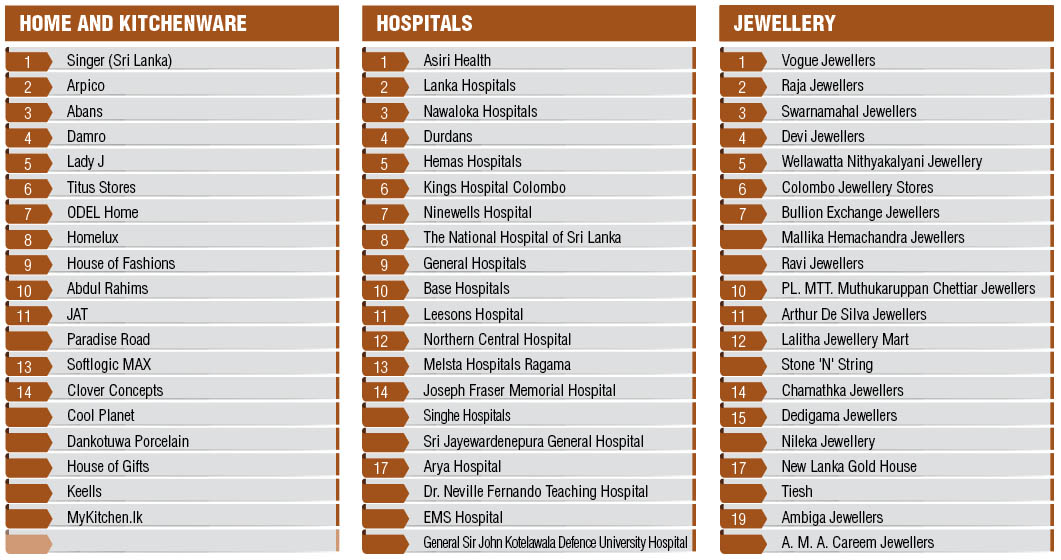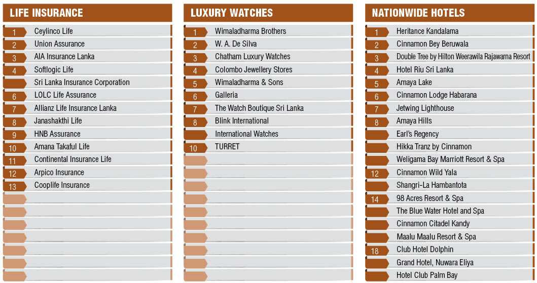 For luxury items, Vogue Jewellers, followed by Raja Jewellers and Swarnamahal Jewellers, continue to be rated as providing the best service in the jewellery milieu; and for services in luxury watches, Wimaladharma Brothers nabs first place from W. A. De Silva.