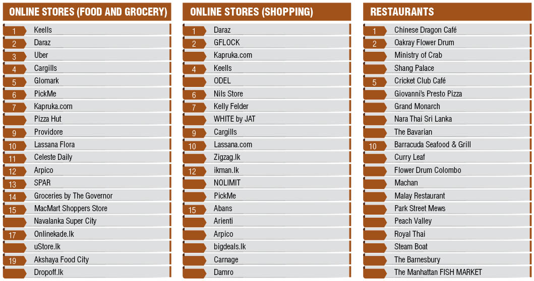 The most popular supermarkets remain Keells, Cargills and SPAR with Glomark advan-cing over Arpico to fourth place. Interes-tingly, in the online stores (food and grocery) space Keells takes the top spot too, and Daraz and Uber complete the top three.