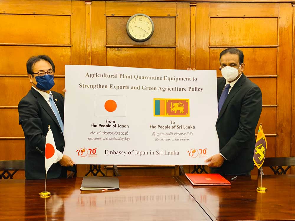 The equipment to be provided includes plant x-ray scanner, DNA sequencing system, incubators, high end microscope, and real time PCR, which will be installed at the NPQS, a facility built in the 1990s by Japan’s grant assistance in Katunayake, and Plant Quarantine Stations at the BIA, Seaport in Colombo, Mahinda Rajapaksa International Airport, and Jaffna International Airport.