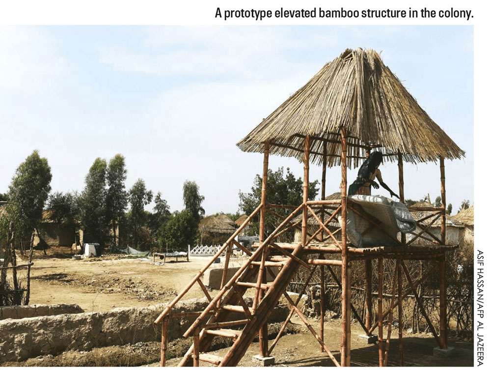 The elevated homes with bamboo skeletons are protected from rushing water whilst withstanding immense pressure against being uprooted. Traditionally known as ‘chanwara,’ the improved single room housing design prototypes have already saved families during the flood season.