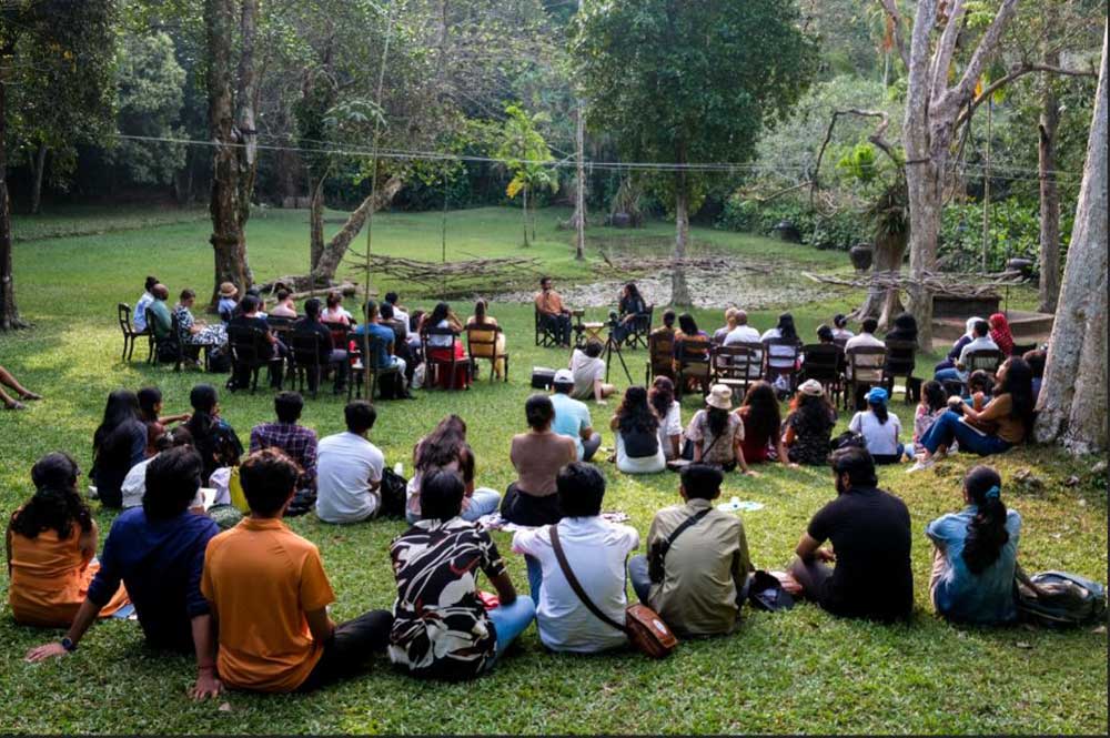 On Saturday, 10th February 2024, artist Firi Rahman and the Geoffrey Bawa Trust gathered visitors to Lunuganga for the launch. Participants began arriving at Lunuganga around mid-afternoon for the first half of the programme, a sketch workshop led by the artist. Having sought to create a piece that is a “more publicly engaging work,” Rahman first spoke about his own methods and techniques. He then encouraged participants to wander about the garden on their own with their sketch materials before reconvening in both individual and group settings to share their creations.