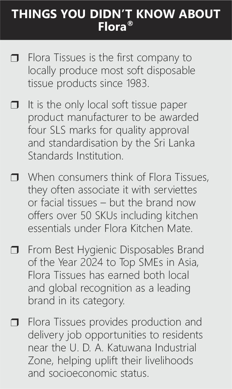 For more than four decades, Flora Tissues has been the leading brand in the category and enjoys a dominant market share in Sri Lanka. As an industry pioneer, the brand is regarded as the preferred choice of purchase – it offers products that are unique, hygienic and innovative. Flora Tissues’ core strength lies in providing quality products that build strong bonds and satisfy consumer needs.