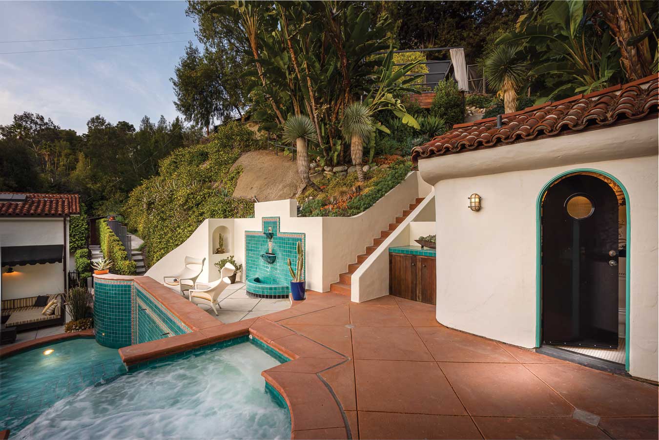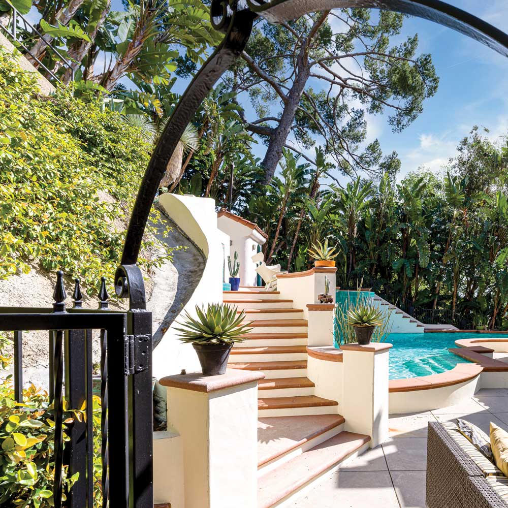 Almost all the rooms open out to attractively landscaped terraces, colourful gardens, courtyards, fountains and views of the Griffith Observatory. There is also a detached bathroom by the pool and spa, and a detached Zen, meditation or yoga room.