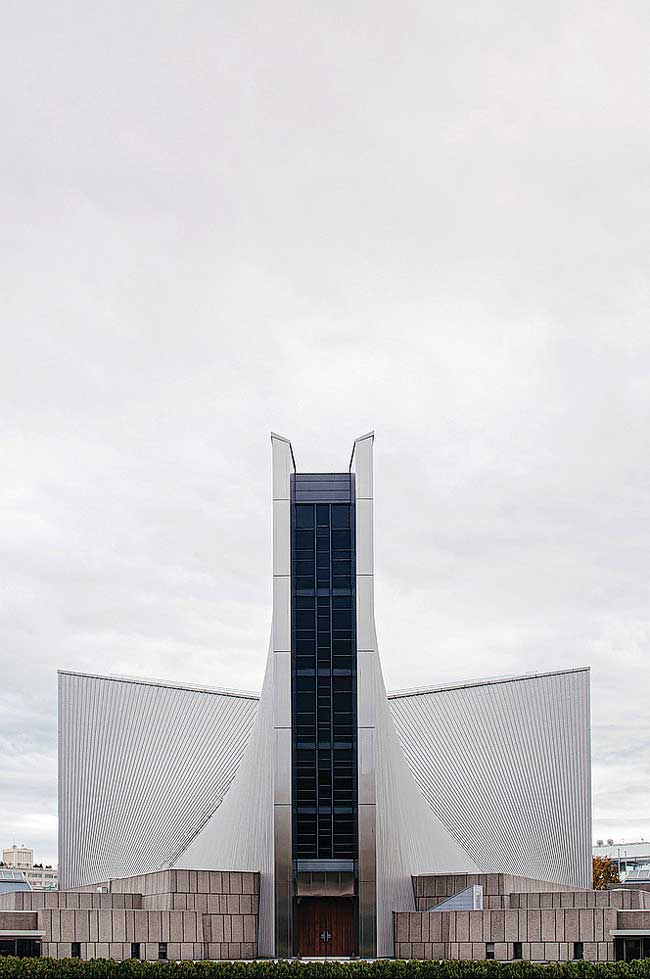 Built to replace the church destroyed during WWII, the stark white walls create an aesthetic of purity and an ethereal atmosphere amidst the wooden terrain. The sculptural character is enhanced with thick curving walls and a massive curvilinear roof that envelopes the heavens.