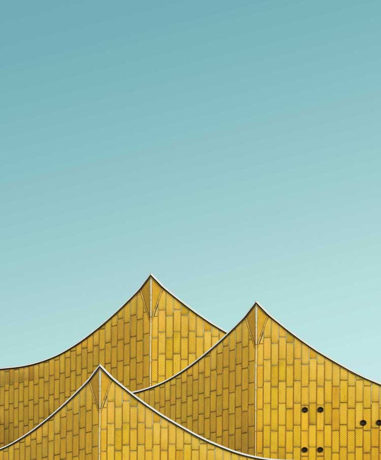 It’s a concert hall that has an organic and futuristic aesthetic. The exterior facade comprises fitted blocks of yellow hued metal with an angled and curvy tent-like structure that pairs well with the surrounding forest landscape.